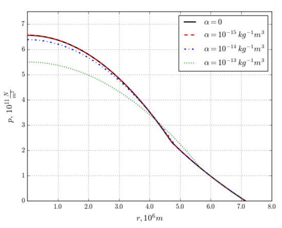 - We also compared the numerical solutions for the pressure obtained from Equations (3) and (4) to the ones resulting from the analytical approach (which are approximated solutions). As one can see, the pressure drops roughly, similar to in the core, and then changes in a linear way in the mantle in the case of both numerical and analytical solution (although it is less pronounced for larger values of the parameter ). One notices that in the case of Newtonian gravity (), analytical (approximated) solution tends to provide smaller values than the numerical one. However, in the case of modified gravity, the effect is the reverse—approximated analytical solution provides larger values than the numerical one. This can be explained in the following way: the analytical approximation does not take into account the effect of modification of gravity in the CMF Formula (6), so it stays constant for various values of the parameter (as it depends of the mass and radius of the planet only, and these values do not change). On the other hand, the numerical method suggests that the size of the core and its mass grow in modified gravity, and hence the CMF must change. This combined effect of change in and CMF/CRF results in a bigger drop in internal pressure.