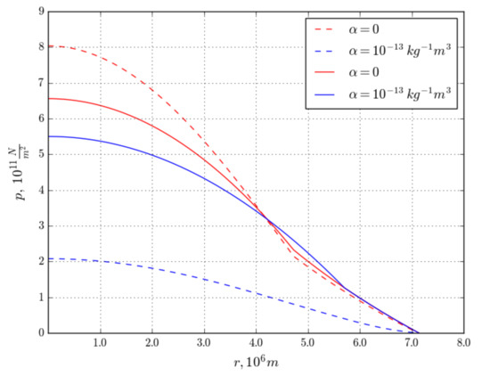 - A similar situation happens when we plot the pressure curves obtained in this work: its central values decrease in modified gravity; however, when we approach the planet’s surface, the mantles do not differ much. This result derives from the fact that the additional term in Equation (15) for the pressure in the mantle is small, and smaller than the extra term appearing in the analogous equation for the core (Equation (18)).