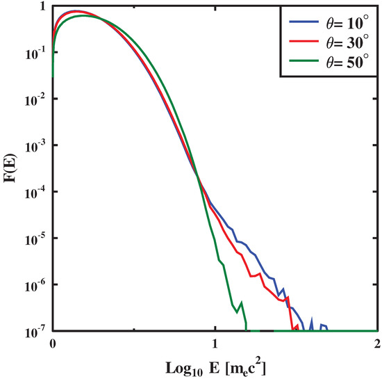 The efficiency of particle acceleration depends on the inclination angle , especially in the case of relativistic flows [44,61,62,65]. To participate in the diffusive acceleration process, a particle needs to escape from the shock front and if it moves along the magnetic field, the maximum velocity along the -axis is , and it should be larger than the shock velocity (all quantities here are measured in the upstream frame). As one can see in Figure 1, the high energy tail of the electron distribution is much higher for a quasiparallel shock. Such an angle dependence may lead to the presence of different electron distributions within one object, and this may possibly explain the difference between the spectral indices of synchrotron radio and inverse Compton X-ray radiation observed in FBOT AT2018cow [9].