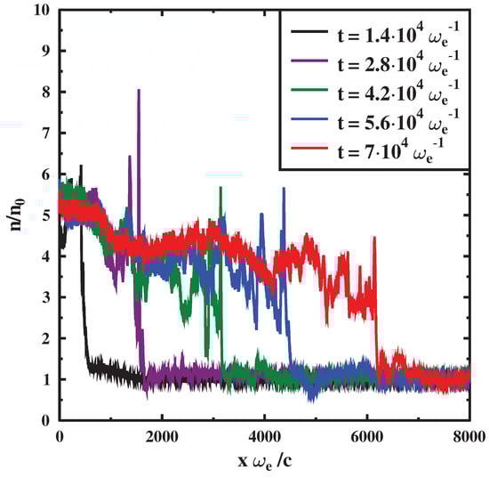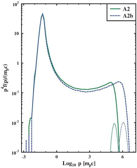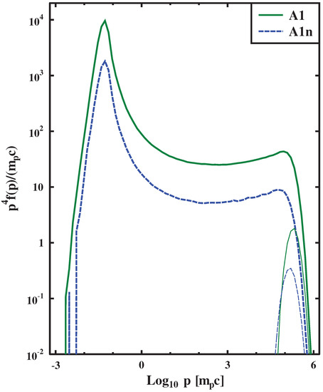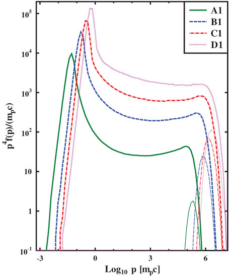 As can be seen from Figure 7, with an increase of the shock speed, the maximum momentum of accelerated particles increases. The value also increases with an increase in the velocity of the shock wave in the range of simulated shock velocities 0.1–0.5 c and it decreases slightly for the shock velocity of (see Table 1) where the transition to relativistic shock regime occurs. Particle-in-cell simulations of electron and proton spectra in the trans-relativistic regime were discussed in [61,62].