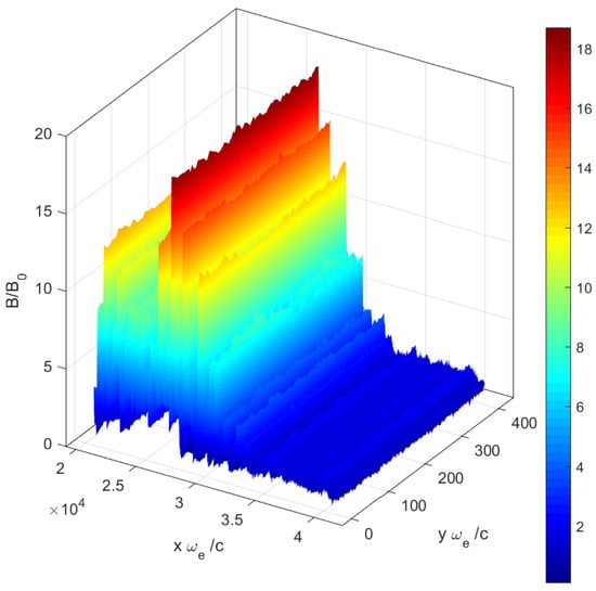 For further modeling of synchrotron radiation from FBOT CSS161010 we have used a setup with parameters 0.3 c, and (a quasiparallel shock). Time evolution of the concentration profile in such a shock averaged in the transverse direction is shown in Figure 2 and the corresponding magnetic field at the moment is shown in Figure 3.