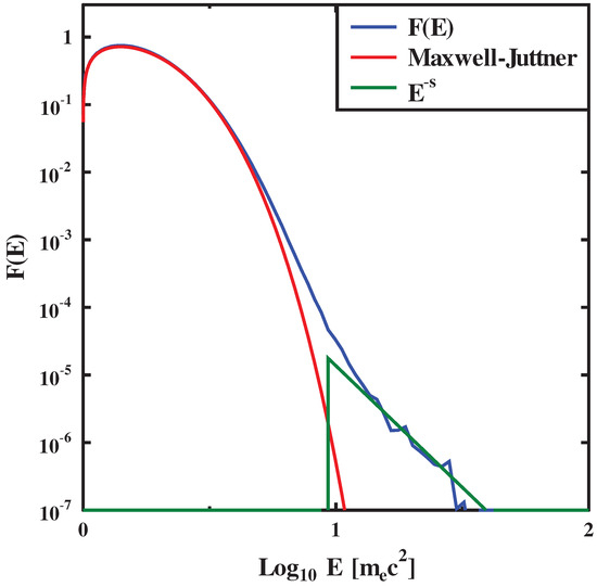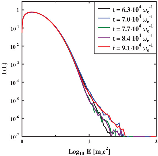 Time dependence of electron distribution function at later stages of simulation is shown in Figure 5. Distribution is not stationary and one can see the oscillation of the electron spectral distribution due to the influence of magneto-hydrodynamic instabilities, as described in [61,66]. So we have chosen the electron distribution at time = 70,000 for the further modeling.