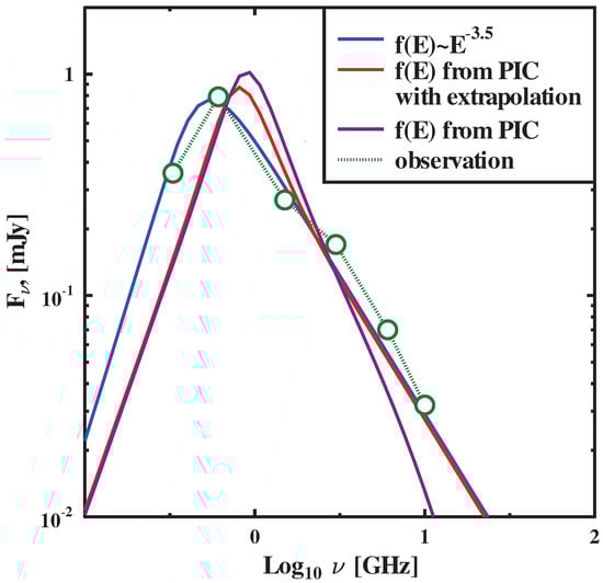 The thermal electrons may contribute substantially to the observed synchrotron spectrum and it was shown in [70] that models with the power law electron distribution might be oversimplified. Additionally, equipartition regime is not very reasonable assumption. Thus, the use of the realistic kinetic simulations is important to model broad band radiation spectra of FBOTs. We have compared the observed fluxes to three models of source emission, evaluated with power law electron distribution and two distributions obtained from PIC simulation: with extrapolation of power law tail to higher energies () and without it. For the first case, we have used the parameters described above. In order to evaluate parameters and of the simulated particle distribution, we minimized the functional , where are the observed frequencies, are the observed fluxes and —the modeled fluxes, using the gradient descent algorithm. We employed six measurements from [10]: four made with VLA at day 357 at frequencies 1.5, 3.0, 6.05 and 10 GHz and two made by GMRT at day 350 at frequencies 0.33 and 0.61 GHz. Concentration in these equations is determined by the magnetic field , obtained from the PIC simulation. One can see that distribution, obtained directly from particle-in-cell simulation, cannot correctly fit the power law tail in observational data, so we had to extrapolate the simulated electron distribution to higher energies because the PIC approach requires a lot of computational resources and thus is not suitable to simulate the considered system up to timescales long enough to form a long tail of accelerated particles. The modeled parameters for extrapolated distribution are G, cm and concentration cm. The values of the magnetic field and radius are rather close to the values from [10], while the concentration is much higher. These results are illustrated in Figure 6.