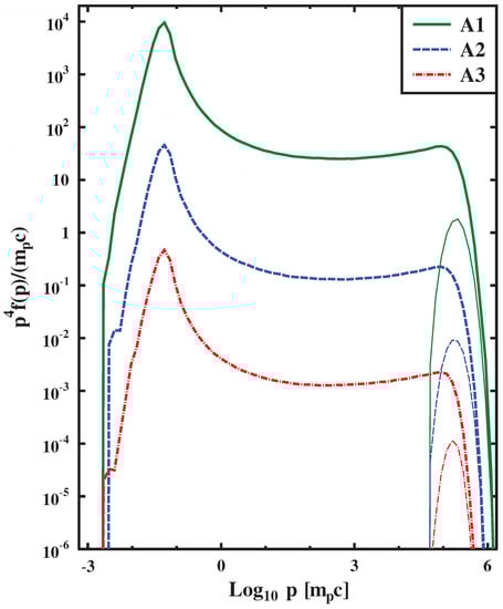 Figure 8 shows particle distribution functions used for evaluations of the models A1, A2 and A3, with varying values of and the magnetic field at the FEB. Note, that with an increase of the FEB distance, the strength of the magnetic field on the FEB decreases proportionally. It can be seen that in these configurations the maximum momenta of the accelerated particles are almost the same. The current of the highest energy particles near the FEB amplify turbulent fluctuations due to the small-scale Bell’s instability on scales much smaller than their own gyroradius. In Figure 9, the spectral energy density of the turbulence is shown at various upstream points for the model A1. Furthermore, it takes time to significantly amplify the magnetic field, and thus, the amplitude of the amplified turbulent field in a significant part of the upstream differs slightly from its value at the FEB (see Figure 10). The gyroradius of the highest energy particles near the FEB turns out to be significantly larger than the scale of the amplified fluctuations, which leads to a small contribution of the expression (8) to the free path (5). Thus, the free path (5) of the highest energy particles in a significant part of the upstream is determined by the contribution (6) with the initial turbulent field. That is, the free path (5) of the highest energy particles in a significant part of the upstream is according to the normalization (36). The non-relativistic theory of DSA gives a simple estimate of the maximum momentum in the case of an upstream path independent of the coordinate: . Accordingly, our model has a good estimate: . In Figure 11, the independence of the maximum particle momentum from the number density in the far upstream is illustrated. In Figure 12, it is shown, that with an increase of the magnetic field with the other parameters kept constant, the maximum particle momentum increases.