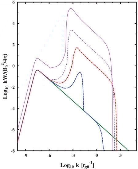 Spectral turbulent energy density for the model A1. The green solid curve corresponds to the point . The blue dashed curve corresponds to the point . The red dash-point curve corresponds to the point . The thin purple dashed curve corresponds to the point . The thin magenta solid curve corresponds to the point (the shock front).