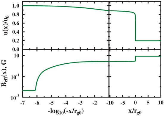 where is the pressure of the entire plasma in the downstream, . We determine the current values , and at this iteration of the quantities from the distribution function obtained after particle propagation. The value is also calculated based on the equation given below. Thus, three unknowns , and remain in the Equations (14)–(16). Solving these equations, we find a new value of . The value for the next iteration is found by averaging the new value and the old one.