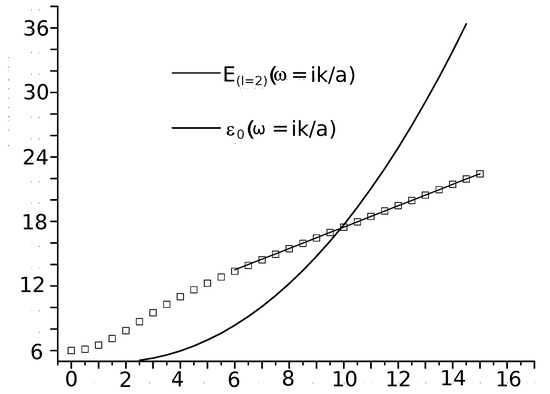 For complex near , a Taylor expansion for for regular solutions of the angular Equation (37) up to order can be found in the literature ([31,32] and references therein). Asymptotic expansionsvvvvvv in the limits where and are also available [32,33,34,35]. For the axial case , and for gravitational perturbations , the angular eigenvalue for large purely imaginary as in (51) behaves as [32]