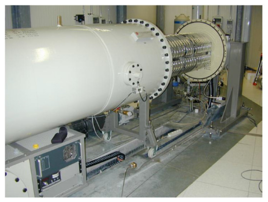 LUNA is located at the INFN Gran Sasso National Laboratory (LNGS), Italy, where the 1400 m of rocks covering the laboratory guarantee a reduction of six (three) orders of magnitude in cosmic muon (neutron) flux. The first accelerator installed underground at LNGS was a compact 50 kV machine [2], now decomissioned, used to perform the first measurements in 1994. In the year 2000, a commercial high-current 400 kV accelerator from High Voltage Engineering Europe, was installed and is actively used for nuclear astrophysics experiments up to this day. Figure 1 shows the tank of the LUNA 400 kV accelerator.