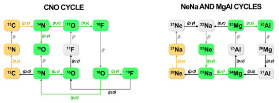 - Rowland, C.; Iliadis, C.; Champagne, A.E.; Fox, C.; José, J.; Runkle, R. Does an NeNa Cycle Exist in Explosive Hydrogen Burning? Astrophys. J. 2004, 615, L37–L40. [Google Scholar] [CrossRef][Green Version]