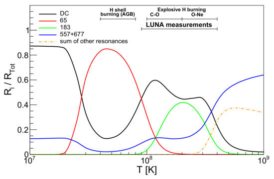 The reaction plays a central role in both AGB stars and nova explosions. In particular, during a nova runaway the and reactions determine the production of the short-lived radioisotope () of key interest for nova nucleosynthesis models. During the thermonuclear runaway (100 MK–400 MK), the rate of the reaction is dominated by the combination of direct capture (DC) contribution and an resonance (Figure 4). Measuring this resonance was the goal of a recent experimental campaign at LUNA [27,28]. A 200 A proton beam was accelerated onto TaO solid target enriched in , and gamma rays were detected with a large-volume HPGe detector in close geometry with the target. This detector was surrounded by a 5 cm lead shield to further reduce natural background. After irradiation, targets were taken to the ultra-low counting facility STELLA [29] at LNGS for activation measurement. The strength of the resonance was measured with unprecedented precision = (1.67 ± 0.12) eV, and several previously undetected transitions were observed, providing improvements on nova models.
