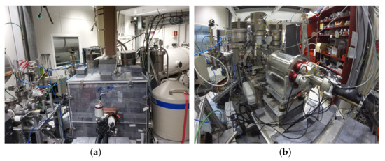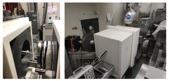 Two experimental campaigns were carried out at LUNA. The main goal of the first campaign was the direct study of the resonances mentioned above, exploiting the deep underground low-background environment. The experimental setup consisted of a windowless gas target chamber filled with mbar gas (isotopic enrichment 99.9%), recirculated and purified by a chemical getter and two large, collimated high-purity germanium detectors, at 55° (Ge55) and 90° (Ge90), respectively, to the beam axis [4]. The scattering chamber and the detectors were enclosed in a copper and lead shielding, to reduce the background caused by natural radioactivity in the laboratory Figure 8b. To further reduce the background due to , the whole shielding was enclosed in an acrylic box flushed with nitrogen vapour.