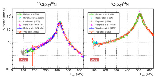 Both and are the first two reactions of the CNO cycle and are of particular interest since they determine the isotopic abundance of carbon inside the hydrogen burning regions. In fact, the / ratio in the stellar surface layers can be used as a tracer of stellar evolution since it is readily derived from stellar spectra [45]. Changes in the isotopic ratio occur when stars evolve from the main sequence towards the Red Giant branch. In particular, during the AGB helium flashes, the hydrogen burning shell temporarily stops burning. As a consequence, the convective envelope penetrates into the C-rich and H-exhausted layers, bringing the freshly synthesized products to the surface. This leads to an increase in the / ratio on the stellar surface. Currently the success in reproducing / ratios appears to indicate that AGB stars experience extra mixing episodes [46]. Furthermore, discrepancies were found in the recent analysis of the presolar SiC grains [47], where it is evidenced that the discrepancy could be solved by extra mixing caused by the magnetic buoyancy [48]. Hence, further insight into complex AGB mixing events can be obtained by constraining the isotopic ratio predictions. Since the ratio of carbon isotopes is highly sensitive to the adopted rates of proton capture reactions, a precise measurement of the magnitude of these reactions is needed to obtain reliable predictions. Numerous past experiments studied the cross-section of both [49,50,51,52,53], and [53,54,55,56,57,58]. Nonetheless, as shown in Figure 7, data at the lowest energies are subject to significant scatter and large uncertainties, affecting extrapolations of the S-factor.