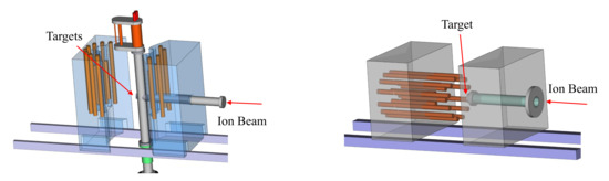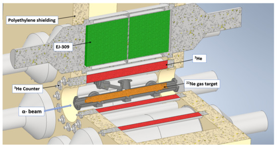 For the study of the reaction, the LUNA collaboration designed and developed a neutron detector array [10]. The experimental setup is based on eighteen counters with low intrinsic background settled in two concentric rings (6 in the inner ring, 12 in the outer ring) around the target chamber and embedded in a polyethylene moderator. To measure the very low cross section of the reaction, the neutron detection efficiency, target handling, and active target cooling must be optimized. Therefore, two detector geometries with vertically and horizontally arranged counters were designed based on extensive GEANT4 simulations (Figure 9).