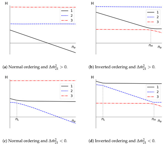 For the ≈ eV under consideration, , since the level crossings are adiabatic. Then Equation (14) simplifies to .