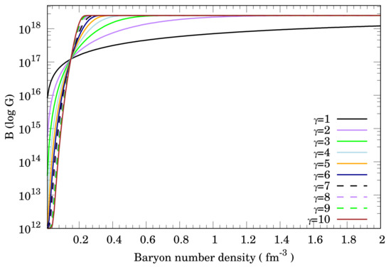 Next, the magnetic field as a function of baryon number density for various parameters is shown in Figure 3. Each line indicates a magnetic field with G and . For fm, is almost constant G. Here, magnetic field strengths at saturation density are given as G for any value of . Magnetic field strengths at saturation density for various parameters are shown in Table 4.