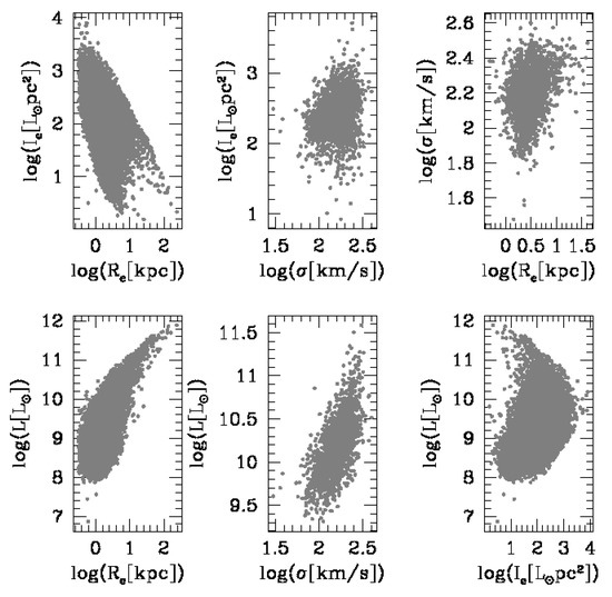 The different projections of the virial plane. The panels including only photometric variables contain a much large number of ETGs with respect to those where the spectroscopic variable is involved.