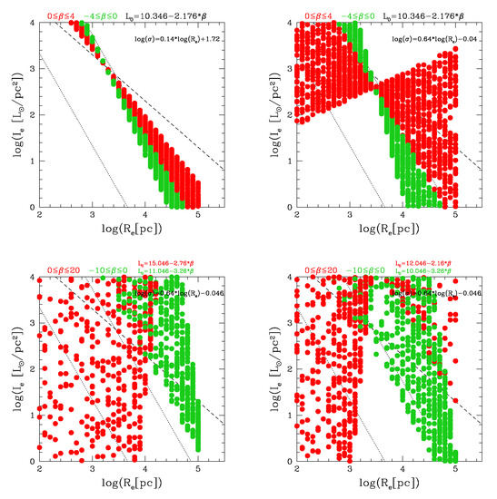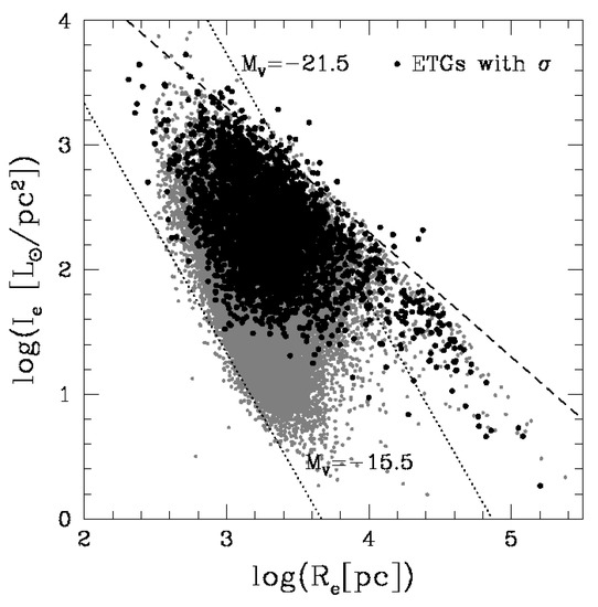 The distribution of galaxies in the parameter space formed by effective radius and effective surface intensity inside this radius , otherwise known as the plane, was discovered by Kormendy in 1977 [3]. He found a log-linear relation with a slope ∼3 (when is expressed in units, and ∼−1.5 when in units) between these parameters using a sample of bright ETGs. As soon as new data for faint ETGs and late-type galaxies (LTGs) became available, the observed linear distribution started to show an ample curvature, clearly separating faint and dwarf objects with respect to bright ETGs [4]. Today, we know that the space is an orthogonal projection of the FP, and it is the most easily accessible correlation of galaxies parameters at low and high redshift.