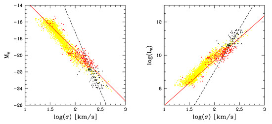 A word of caution is needed on the adopted velocity dispersion. Our sample uses the measured by the SDSS and NOAO surveys (see [46] for details), and it is by no means complete. The measured velocity dispersion spans a wide interval of luminosity, so dwarf and giant objects are both present in the sample. The lack of completeness does not affect our conclusions because we do not use these data in any statistical calculation. The observational samples are used here only for a qualitative comparison with the objects derived from our simulations (see below). A second aspect to consider is that we used the values of measured within a fixed aperture of 3 arcsec (as in the SDSS). Thus, one might question if our results depend on the adoption of this choice and change using a velocity dispersion averaged within the effective radius (temporarily indicated as ) instead of (measured in the central region). The issue is likely relevant for CD galaxies that have large envelopes that are generally ignored by the standard measurements of the velocity dispersion. However, this is not a problem in our study because, in our sample, very few CDs are present and because and are known to be related each other by the relation: (see [48,49] for details). This implies that the net effect of such change is a variation of the slope and the proportionality factor of the FJ, while the scatter of the relation remains nearly the same. Consequently, there are no effects on the vs. FJ issue.