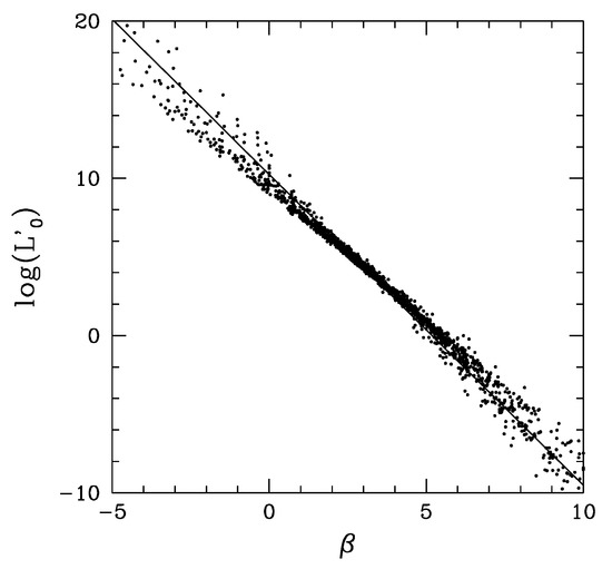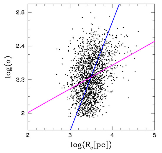 We now start to explore Equation (7) to obtain the plane. Since and are each are correlated by the VT via the mass, we decided to use the dependence of on Re (, see below) and to express as a function of only. It is important to keep in mind here that, at each luminosity, only a small spread of possible is permitted by the FJ. The function can be derived from the WINGS database and is shown in Figure 4. As expected for each value of , there is a large dispersion of and vice versa at variance with the FJ. To cope with this, we try two kinds of fits of the relation with the SLOPES software [64]: the bi-linear least square fit (shortly bisector) indicated by the blue line and the standard least square fit (shortly best fit) shown by the magenta line in Figure 4.