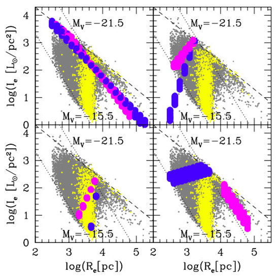 Another interesting feature of the diagram is the presence of a zone of exclusion (ZoE), a region strictly avoided by galaxies. The distribution of galaxies appears limited in the maximum surface intensity at each . The slope of this line of avoidance is close to (when is units), i.e., the slope predicted by the Virial Theorem (VT) [5]. The existence of the ZoE was first noted by [28,29] using the k-space version of the FP. They described the ZoE with the equation . In the k-space, the dynamically hot stellar systems appear segregated, with a major sequence formed by luminous ellipticals, bulges and some compact ellipticals. A second sequence is formed by dwarf ellipticals and dwarf spheroidals. The k-space was used to infer the main physical properties of galaxies, looking at the role played by merging, dissipation, tidal stripping and winds. Several speculations have been attempted up to now to explain the origin of the ZoE (see, e.g., [30]).