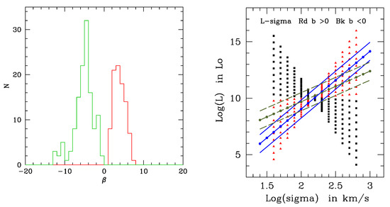 Despite the fact that the and relations cannot be built with the same galaxies because of the different sources of data, the ones we have presented are fully adequate as far as our aims are concerned, i.e., (i) to highlight the bi-modal distribution of the data in the relation and prove the curved behavior of the classical FJ relation that are seen to occur at the same luminosity in both diagrams (); (ii) to show that the distribution in the plane (Figure 2) is much broader and curved than that of the plane (Figure 3); and (iii) to call attention to the fact that it is not possible to pass from the FJ to the without using other information. In other words, as already pointed out above in Equation (5), we will demonstrate here that the classical FJ relation (luminosity steadily increasing with the velocity dispersion) of ETGs (Figure 3), in which and are confined in a small range, is not consistent with the distribution of the same objects observed in Figure 2.
