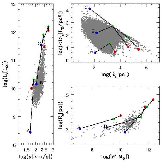 It is important to note, however, that the luminosity of each galaxy enters in the above equations only as a proxy of the stellar mass without considering its physical intrinsic characteristics, i.e., neglecting the role of mass accretion, star formation and evolution of the stellar content, while taking only the mean mass-to-light ratio into account. As remarked by [50], when the total luminosity enters in a SR, it brings with it a “degeneracy” that, depending on the correlation under exam, may imply either the use of L as a proxy of M or as the tracer of a past merger and the star forming activity and even the natural evolution of the stellar content. They showed that the total luminosity can be written as: