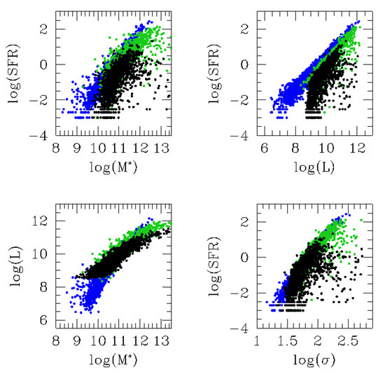 It should be remarked that the construction of depends on L and , the luminosity, in turn, on the stellar mass and, finally, on and . Therefore, the large dispersion in each group can be ascribed to the large range of spanned by objects of a given mass.