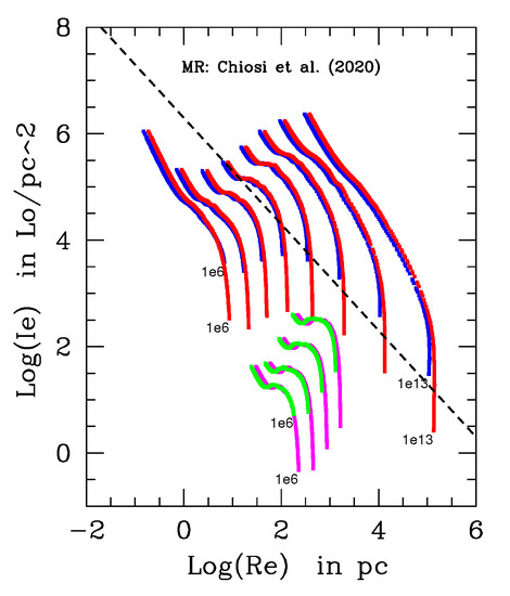 The projected light and mass profiles using the plane as a reference plane were studied in the paper of [51]. Starting from the magnitudes and positions of the stellar particles, we computed the effective radius Re and effective surface brightness , the radial surface brightness profiles, the best-fit Sérsic index and the line-of-sight velocity dispersion following Zahid et al. [55].