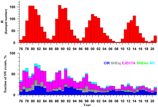 Yearly number of sunspots (upper panel) and fractions of disturbed SW events (bottom panel; legend is shown on the panel) during the period of 1976–2021.