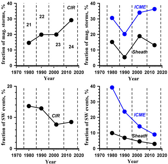 Temporal profiles of fraction of magnetic storms (upper panels) and fraction of SW events (bottom panels) during solar cycles 21–24: for CIRs (left panels), sheaths (right panels, black circles) and ICMEs (right panels, blue circles).
