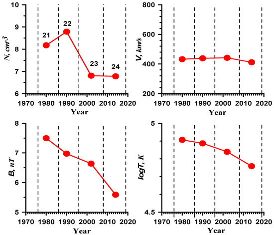 - Because during SCs 23–24, the temperature and IMF value dropped at a constant velocity, the sonic and Alfvén Mach numbers in the solar wind increased, i.e., in the present epoch, the magnetosphere is flowed around by more “supersonic” and more “super-alfvenic” SW than in the previous SCs 21–22. In addition, the drop in the beta parameter (not shown here but presented in [10]) indicates that the drop in magnetic pressure was less than the drop in thermal pressure. Therefore, the regime of the SW flow around the magnetosphere of the Earth and their interaction may differ from that during the previous period.