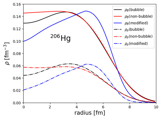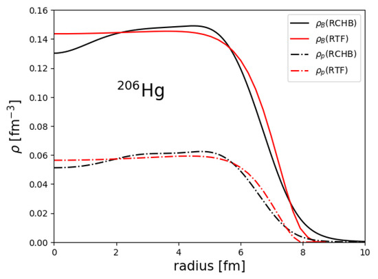 where is the central density of the nucleus and is the maximum density of the nucleus. In Figure 1, we show the nucleon density distribution of Hg obtained from the RCHB theory (with a bubble structure) and from the relativistic Thomas–Fermi (RTF) theory (without a bubble structure). With the RCHB theory, the DF factors for the total and proton densities are 13% and 18%, respectively.