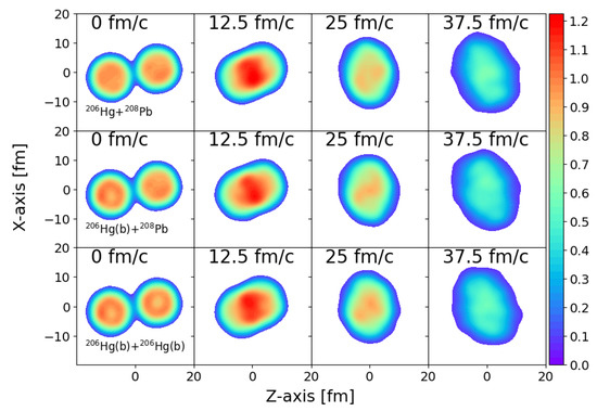 Comparison among the density distribution of three systems in the reaction plane with A MeV and the impact parameter 3 fm. From top to bottom, the corresponding systems are Hg (nonbubble) + Pb, Hg (bubble) + Pb and Hg (bubble) + Hg (bubble) and “b” in parenthesis is the abbreviation of bubble.
