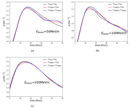 The densities at the collision center at = 50 (a), 100 (b) and 200 (c) A MeV when the impact parameter is 3 fm. The black, red and blue lines are for Hg (nonbubble) + Pb, Hg (bubble) + Pb and Hg (bubble) + Hg (bubble) systems, respectively.