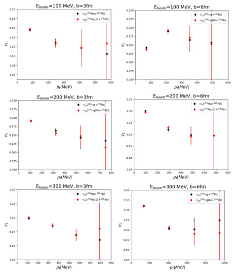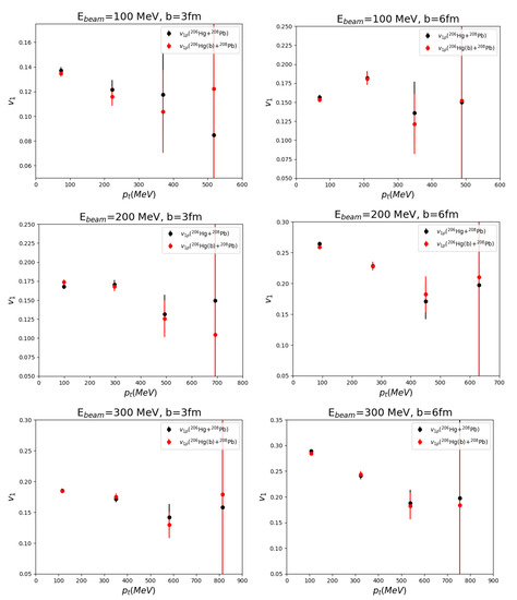 The directed flow of protons in Hg (nonbubble) + Pb (in black) and Hg (bubble) + Pb (in red) reactions.