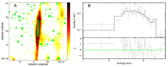 Extensive surveys of the field around the GC have been carried out in X-ray (e.g., [4,25,26,27]). Figure 4 presents a field mapped by Chandra/ACIS-I [27]. A few sources are detected in this field with the local false detection probability . The detection flux limit depends on the source spectral shape, as well as the local background intensity, exposure, and point spread function of the instrument. Detected sources in the GC typically have individual luminosity , which include black hole/neutron star X-ray binaries (active or quiescent), young pulsar and pulsar wind nebula (PWN) candidates (e.g., [4,25,28]). Undetected fainter sources should represent numerous stars, primarily cataclysmic variables and active binaries [4,29]. Their collective contribution should intrinsically follow the old stellar distribution in the field and may dominate the “diffuse” (detected source-excised) emission above ∼4 keV; the appearance of the softer X-ray emission (e.g., Figure 4B) is strongly affected by the differential foreground absorption across the field.