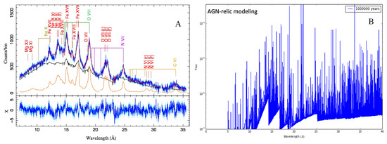 (A) RGS spectrum of the M31 inner region (the data are in blue, while their errors are in cyan), together with the model fit with an AGN relic+ model [67]. The model has been convolved with the angular structure function of a Chandra 0.3–0.7 keV image. The orange and black curves represent the AGN relic component itself and the combination of discrete source and sky background contributions. (B) Representative spectrum of a time-dependent over-ionized plasma; the recombination edge of OVIII is apparent at wavelength near 15 Å, for example.