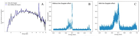 Illustrations of mock data of Sgr A* X-ray observations: (A) an integrated spectrum of the planned XRISM 100-ks Resolve observation, compared with a “perfect” mock spectrum assuming an artificial ks exposure; (B,C) close-ups of the spectral range around the Fe 6.7 keV triplet for a mock 100-ks concept mission Lynx X-ray microcalorimeter [70], demonstrating how the Doppler effect of the flow with the 1″ radius of Sgr A* may be measured to offer new insight into the accretion and outflow processes.