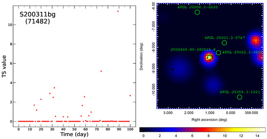 (Left) TS curve with 1-day time bin from −1 to 100 days of the BBH merger trigger S200311bg for J000400.89−082515.8 (71482). A TS data point is seen at 88 days. (Right) 0.3–500 GeV TS map with a size of for the high-TS data point. The 4FGL sources in the field are marked with circles. The position of the target galaxy is marked with a cross, while a dashed black circle is the 2- error circle (radius 0.11 deg) determined for the candidate -ray source.