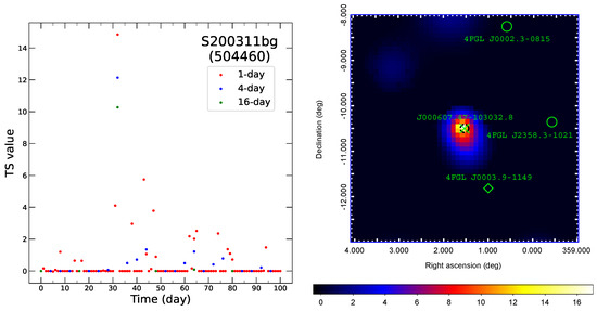 (Left) The 1-, 4-, 16-day binned TS curves from to 100 days of the BBH merger trigger S200311bg obtained for J000607.47−103032.8 (504460). A TS event is seen at 31 days in all the TS curves. (Right) The 0.3–500 GeV TS map with a size of made from the 1-day bin data that corresponds to TS . The 4FGL sources in the field are marked with circles or a diamond, the latter indicating a Log-Parabola spectral form for the source. The position of the target galaxy is marked with a cross, while the dashed black circle is the 2- error circle (radius 0.09 deg) determined for the candidate -ray source.