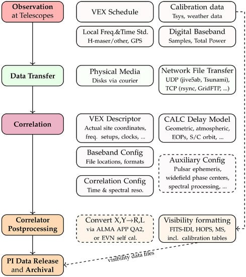 After a correlation run (bottom of Figure 1), the output data are typically converted from a correlator-native format into the widely adopted FITS-IDI 6, Common Astronomy Software Applications (CASA) Measurement Set (MS) 7, Haystack Observatory Postprocessing System (HOPS)/MkIV 8, or vgosDB NetCDF 9 Metadata or single-dish measurements (top of Figure 1) may further be attached to the visibility dataset as calibration tables. These may include system temperatures, antenna gain-elevation characteristics, weather data, flagging tables, and phase cal tones.