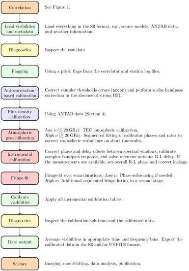 Errors in the data, which can typically be traced back to single antennas, are often not trivial to find; a variety of diagnostic tools and visualizations that make different cuts through the data are needed. Some—but typically not all—errors can be identified at the signal stabilization step. Appendix B provides an overview of how bad data can be identified and dealt with at the different data-reduction stages. Calibration errors are easily baked into the data and can have substantial effects on the final scientific results. A typical order of VLBI calibration operations are shown in Figure 2. Comprehensive and well-tested software suites are generally used for the primary calibration steps. The most common software packages are described below. Note that tools for the flux density calibration (Section 4), imaging (Section 5), and advanced calibration methods for polarimetry (Section 6.1), spectral lines (Section 6.2), and wide fields of view (Section 6.3) are implemented in several of these packages.