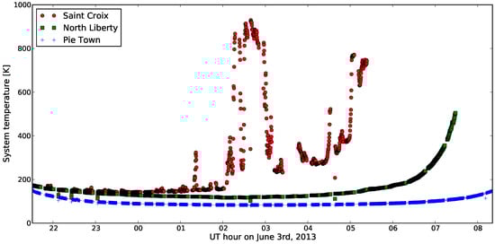 Example of effective (opacity-corrected) system temperatures measured by three VLBA antennas from observations of M87 at 43 GHz (project code BW0106). Pie Town system temperatures show slight increases at the beginning and end of the observing track, where the source is at a low elevation. The source us set at the end of the track for the North Liberty station, which causes an increases in system temperature. Bad weather is responsible for the highly variable system temperature measurements at Saint Croix.