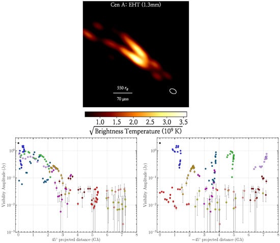 - Janssen, M.; Falcke, H.; Kadler, M.; Ros, E.; Wielgus, M.; Akiyama, K.; Baloković, M.; Blackburn, L.; Bouman, K.L.; Chael, A.; et al. Event Horizon Telescope observations of the jet launching and collimation in Centaurus A. Nat. Astron. 2021, 5, 1017–1028. [Google Scholar] [CrossRef]