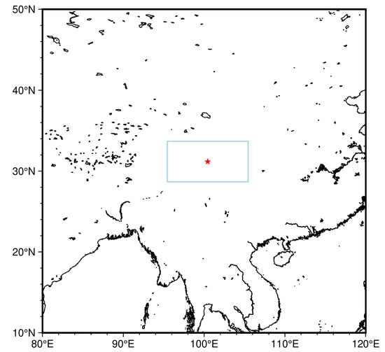 The ionosonde’s location and the selected region of the COSMIC observations. The red star denotes the ionosonde at Ganzi (31.2° N, 100.4° E), while the 5° × 10° rectangle is the selected region of the COSMIC tangent point.