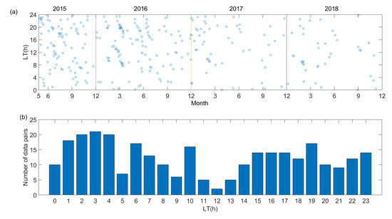 (a) The temporal distribution of selected data pairs, in which one circle means one data pair; (b) the number of selected data pairs in 1 h local time bins.