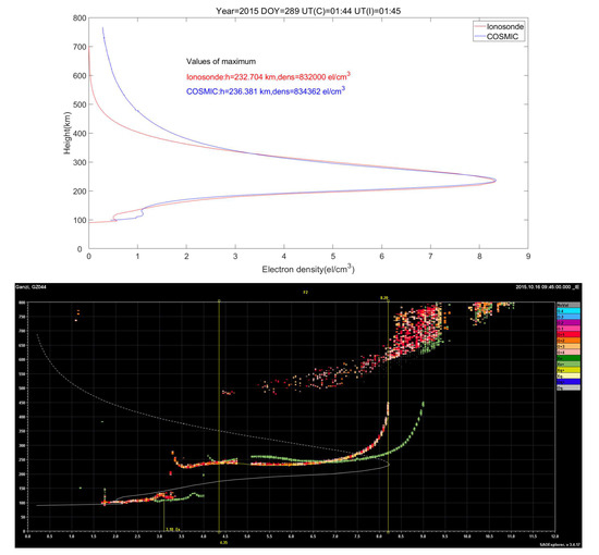 Figure 4 shows the comparison of an individual COSMIC RO event and corresponding ionosonde observation. The maximum electron density of COSMIC RO occurred on 16 October 2015 at 01:44 UT (09:44 LT), while the corresponding ionogram recorded by the ionosonde occurred on 16 October 2015 at 01:45 UT (09:45 LT). The position of the COSMIC RO maximum electron density is at 32.8° N, 100.9° E, which is close to the Ganzi station (31.2° N, 100.4° E).