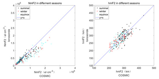 Furthermore, the correlation of the parameters in different seasons, namely, summer (May to August), winter (November to February), and equinox (March to April and September to October), is also investigated. Figure 6 shows the NmF2 and hmF2 from COSMIC measurements and ionosonde observations in different seasons. Table 2 shows the correlation coefficients of the parameters between the COSMIC measurements and ionosonde observations in different seasons. The number of selected data pairs in the summer, winter, and equinox are 117, 75, and 105, respectively. The correlation coefficient of the NmF2 is highest during the winter and lowest during the summer, while the correlation coefficient of the hmF2 is highest during the equinox and lowest during the summer. In general, the differences of correlation coefficients of the NmF2 and hmF2 during three seasons are small.