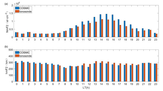 Hourly NmF2 (a) and hourly hmF2 (b) of local time obtained from the COSMIC measur–ements and ionosonde observations.