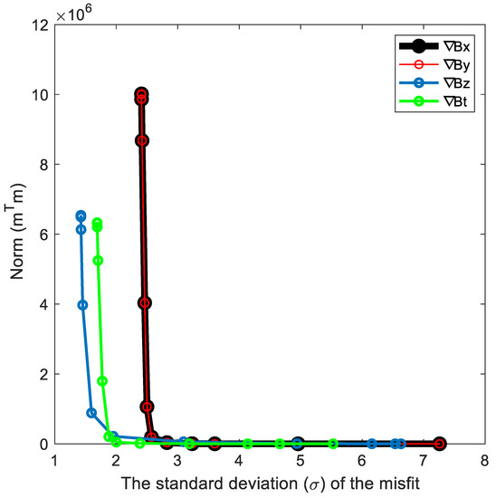 The trade-off curve of the north–south , , , and . The variation of the norm (m) with respect to the standard deviation () of the misfit shows that the knee of the curve is located at the damping parameter, equaling .